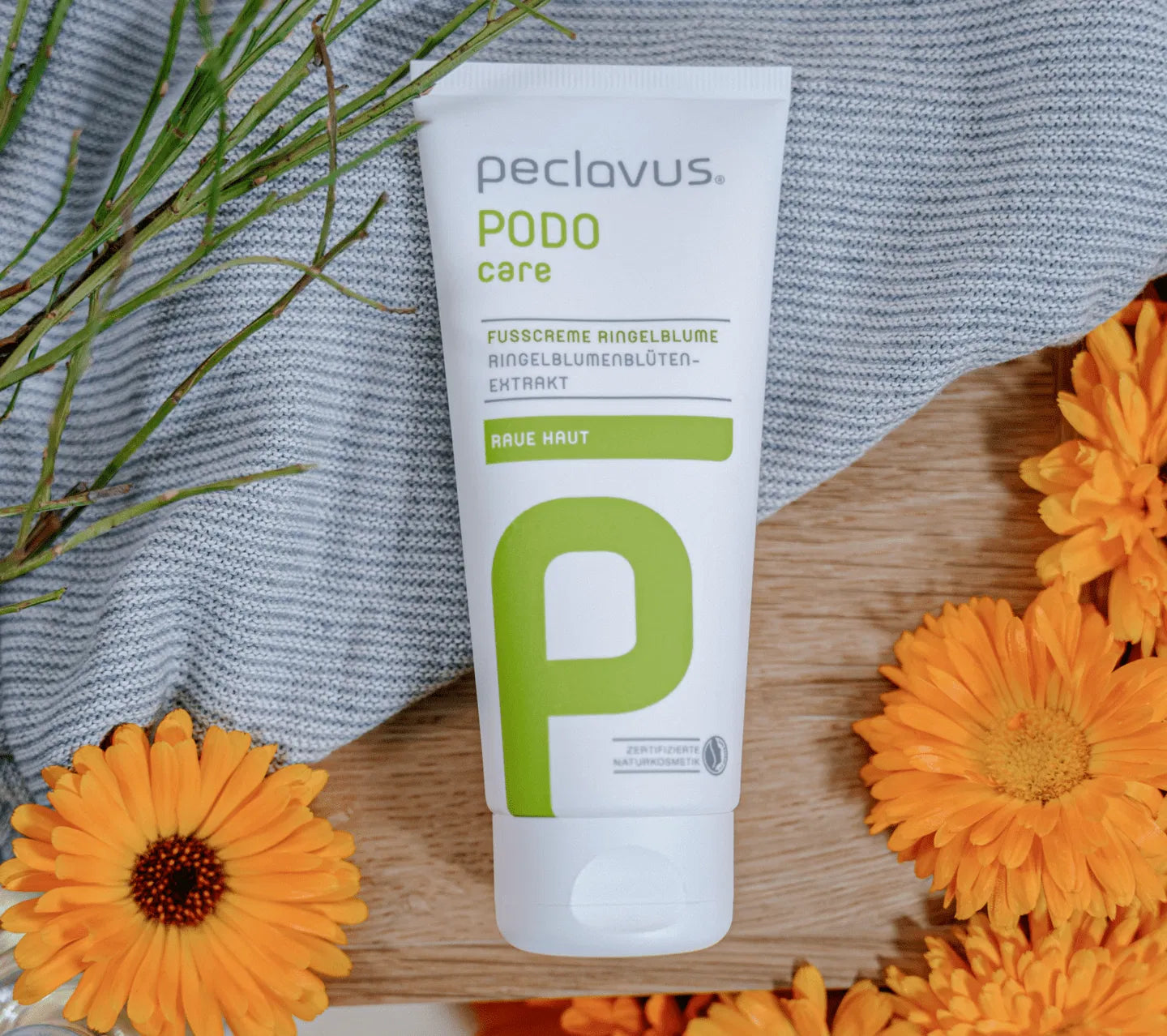 Die peclavus® Fußcreme Ringelblume vereint natürliche Pflege und regenerierende Eigenschaften, um trockene und beanspruchte Fußhaut wieder geschmeidig zu machen. Dank der heilenden Kraft der Ringelblume ist diese Creme besonders für sensible Haut geeignet.
