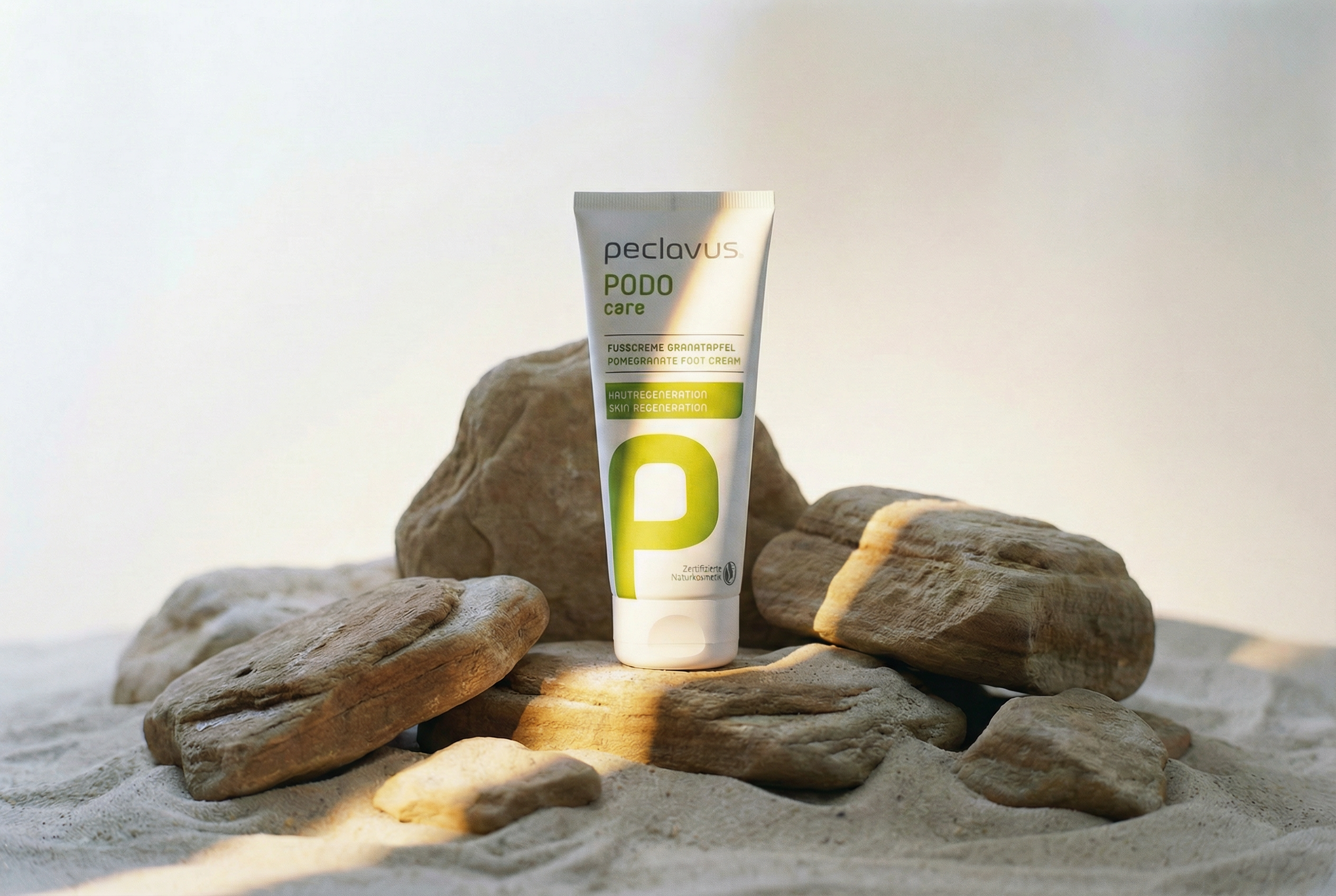 Die peclavus® PODOcare Fußcreme Granatapfel regeneriert die Haut und macht die Füße fruchtig-frisch. Dafür sorgen natürliche Antioxidantien aus zellerneuerndem Bio-Granatapfel-Extrakt zusammen mit wertvollem Bio-Wildrosenöl. Das reich enthaltene Öl der Macadamianuss schützt zusätzlich die Hautbarriere. Eine optimale Pflege für beanspruchte Füße. Für alle Hauttypen geeignet.